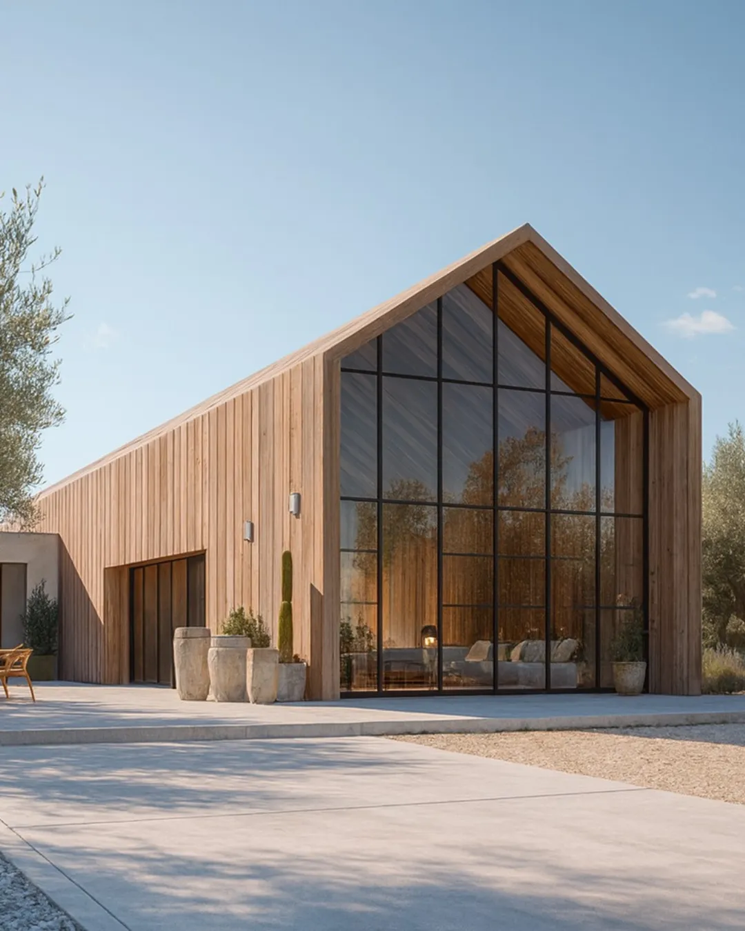 Linhas minimalistas e um design contemporâneo em madeira natural, a casa abre-se ao exterior através de amplas janelas envidraçadas que inundam os interiores de luz e criam uma ligação perfeita entre a arquitetura e a paisagem.